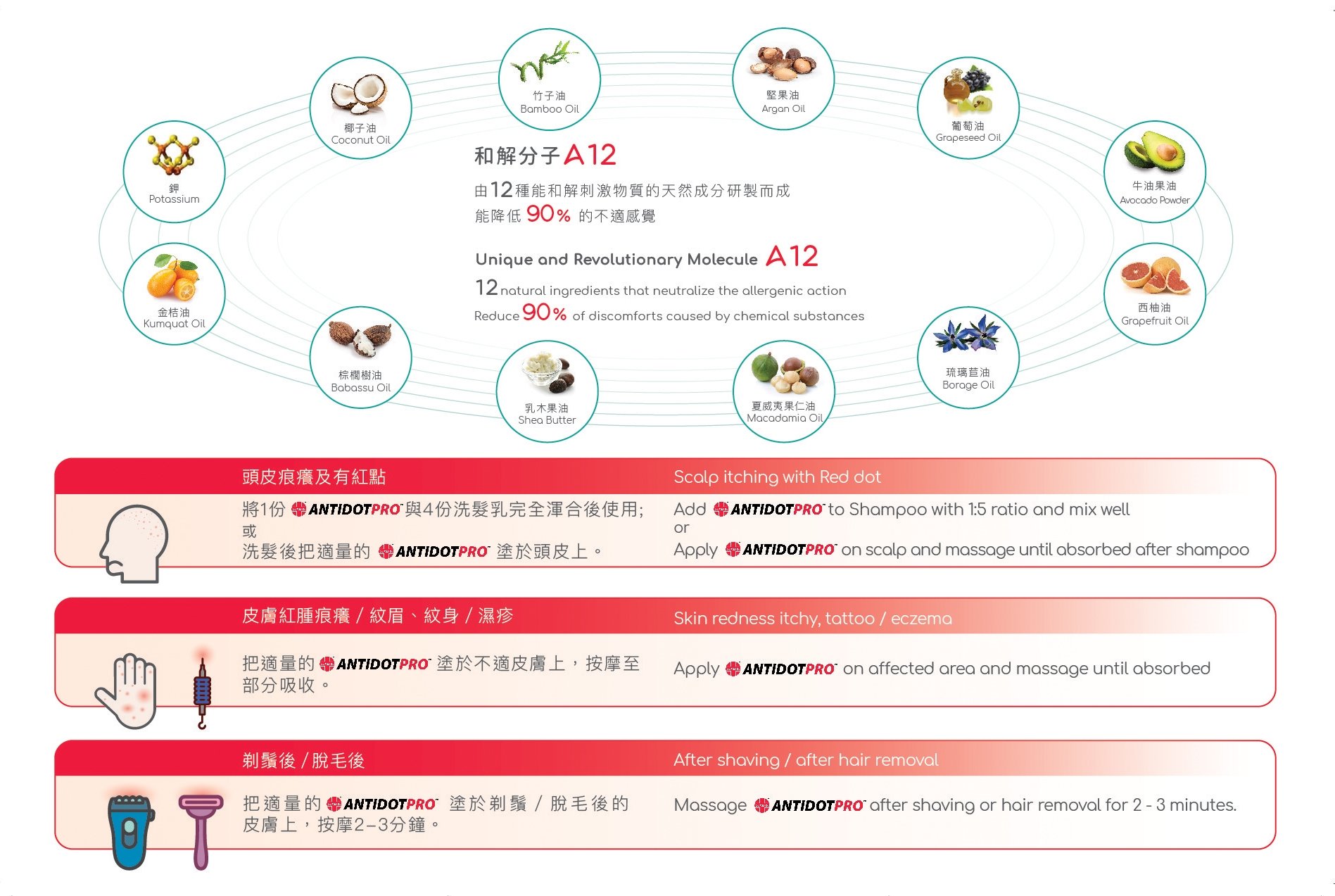 和解分子A12 – 由12种能和解刺激物质的天然成分研製而成, 能降低 90%的不适感觉。